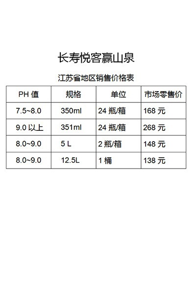 長壽悅客贏山泉 江蘇省地區銷售價格表 2021-12-07